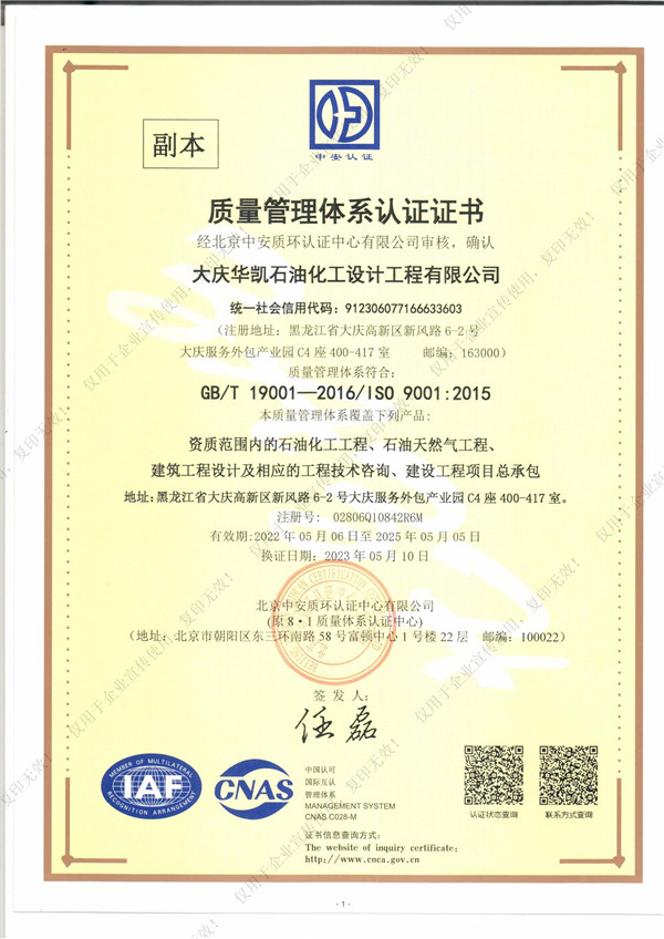 近日,我司順利通過質(zhì)量管理體系認(rèn)證,這標(biāo)志著華凱公司在項目質(zhì)量體系建設(shè)上已經(jīng)達到了相關(guān)標(biāo)準(zhǔn)。質(zhì)量管理體系認(rèn)證證書的取得同時也是公司各項管理工作的規(guī)范化、標(biāo)準(zhǔn)化的體現(xiàn),是對公司持續(xù)穩(wěn)定健康發(fā)展的重要保證。我們將進一步優(yōu)化和規(guī)范各項管理制度,不斷提高體系運行的有效性,不斷提高公司的管理水平,共同推進公司的快速發(fā)展。自此,華凱公司質(zhì)量管理體系的標(biāo)準(zhǔn)化、規(guī)范化及科學(xué)化又邁上新臺階。